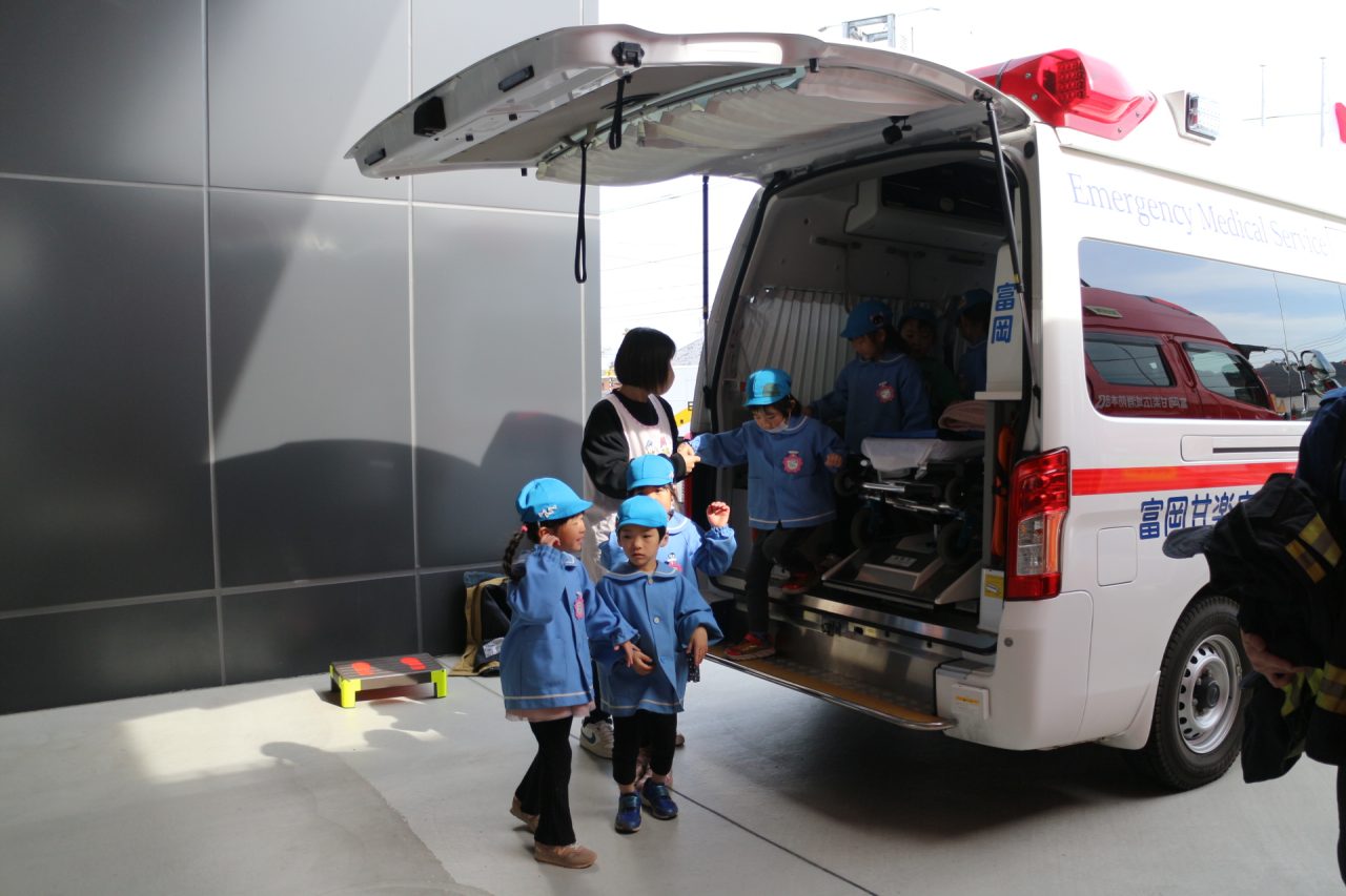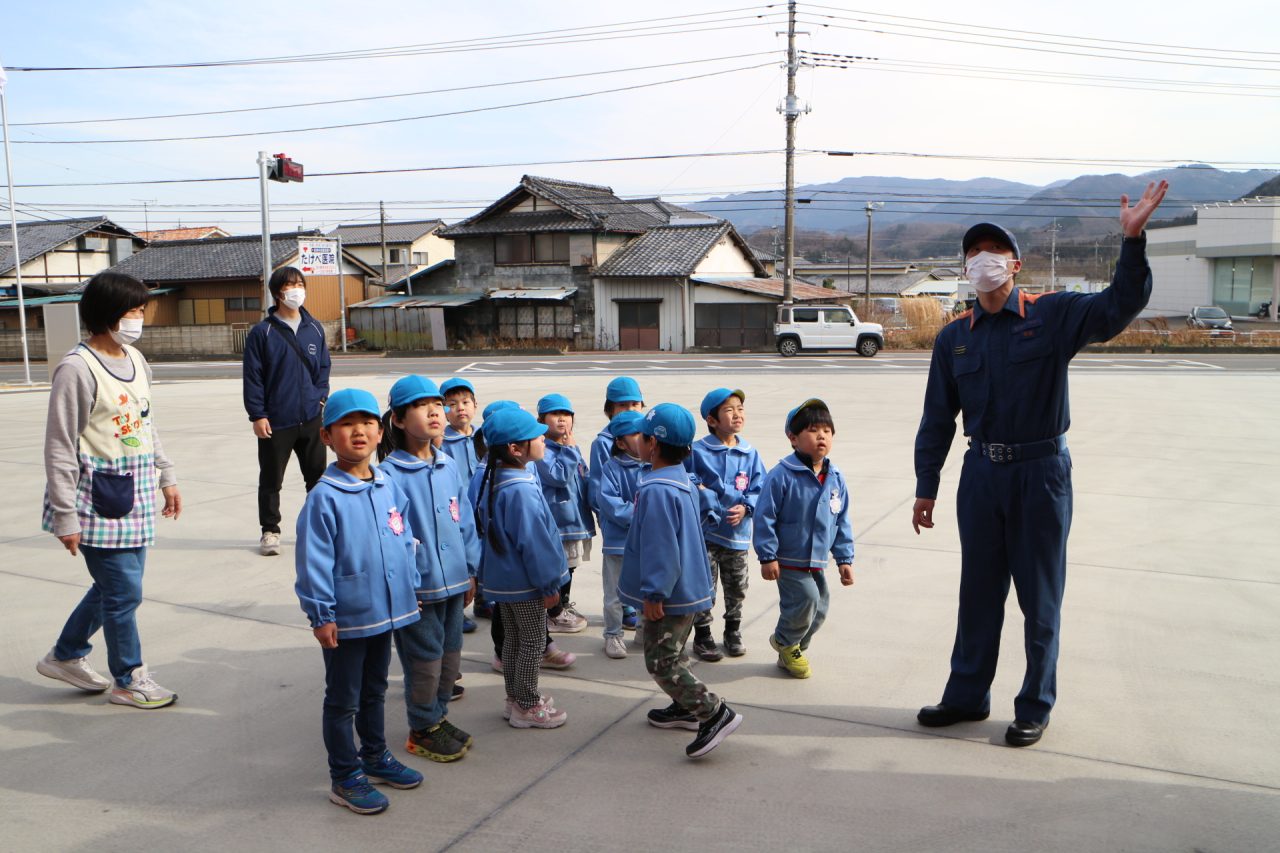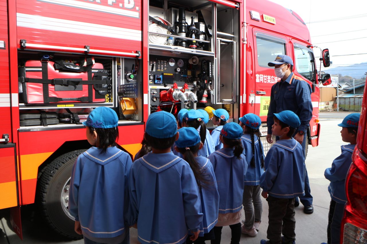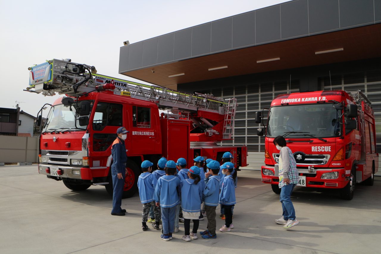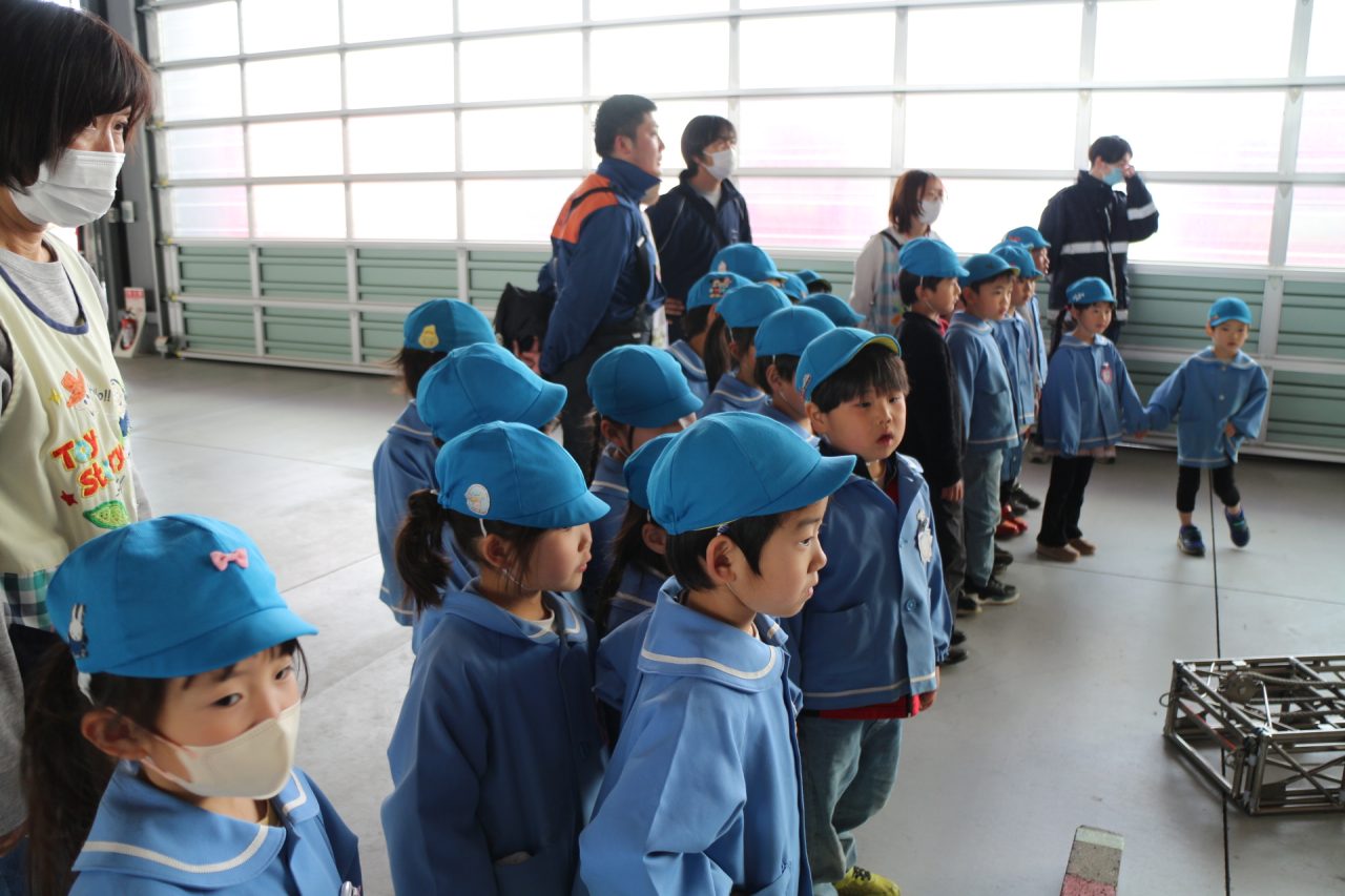 消防署へ塗り絵を見に行きながら、消防車や訓練の様子を見せてもらいに行きました。塗り絵は、自分のものをみんな見つけて大喜びしていました。消防車を見せてもらったり、訓練も見せていただきました。訓練はとても真剣で見ている子どもたちにも伝わり、いつの間にか『がんばれー!!』と応援している子もいました。みんなの命を守るのには自分たちの命も守らなくてはいけない、そのためには大変な訓練も必要だということが子どもたちにも伝わったのではと思います。