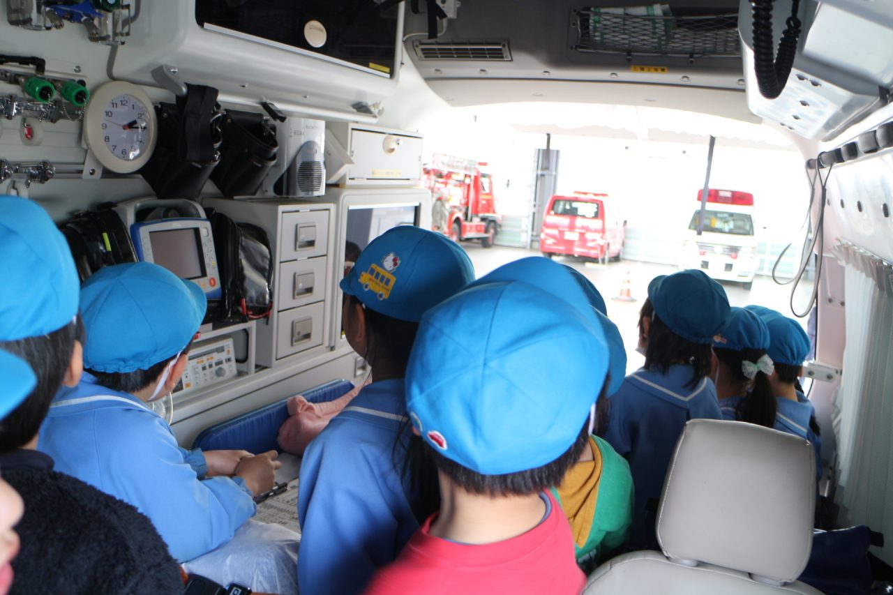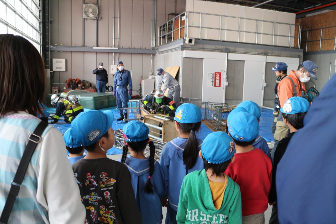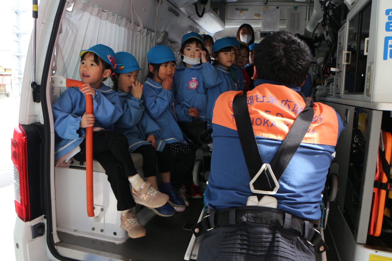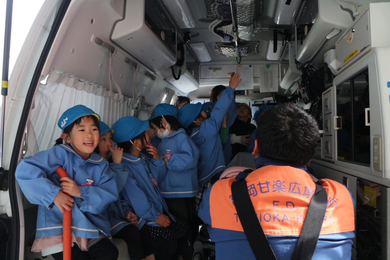 消防署へ塗り絵を見に行きながら、消防車や訓練の様子を見せてもらいに行きました。塗り絵は、自分のものをみんな見つけて大喜びしていました。消防車を見せてもらったり、訓練も見せていただきました。訓練はとても真剣で見ている子どもたちにも伝わり、いつの間にか『がんばれー!!』と応援している子もいました。みんなの命を守るのには自分たちの命も守らなくてはいけない、そのためには大変な訓練も必要だということが子どもたちにも伝わったのではと思います。