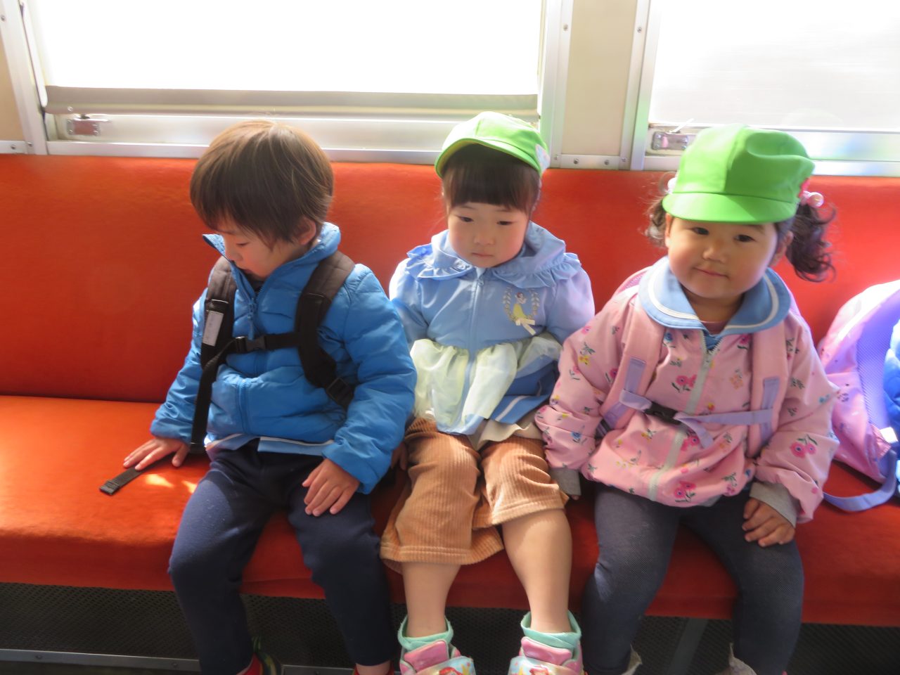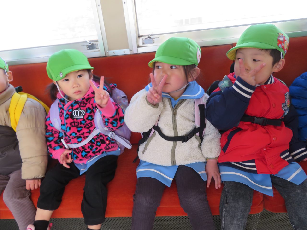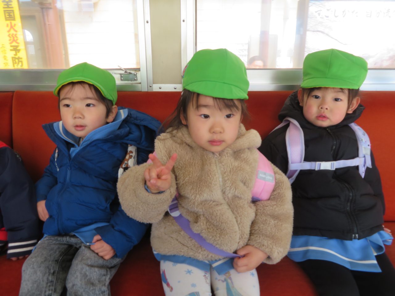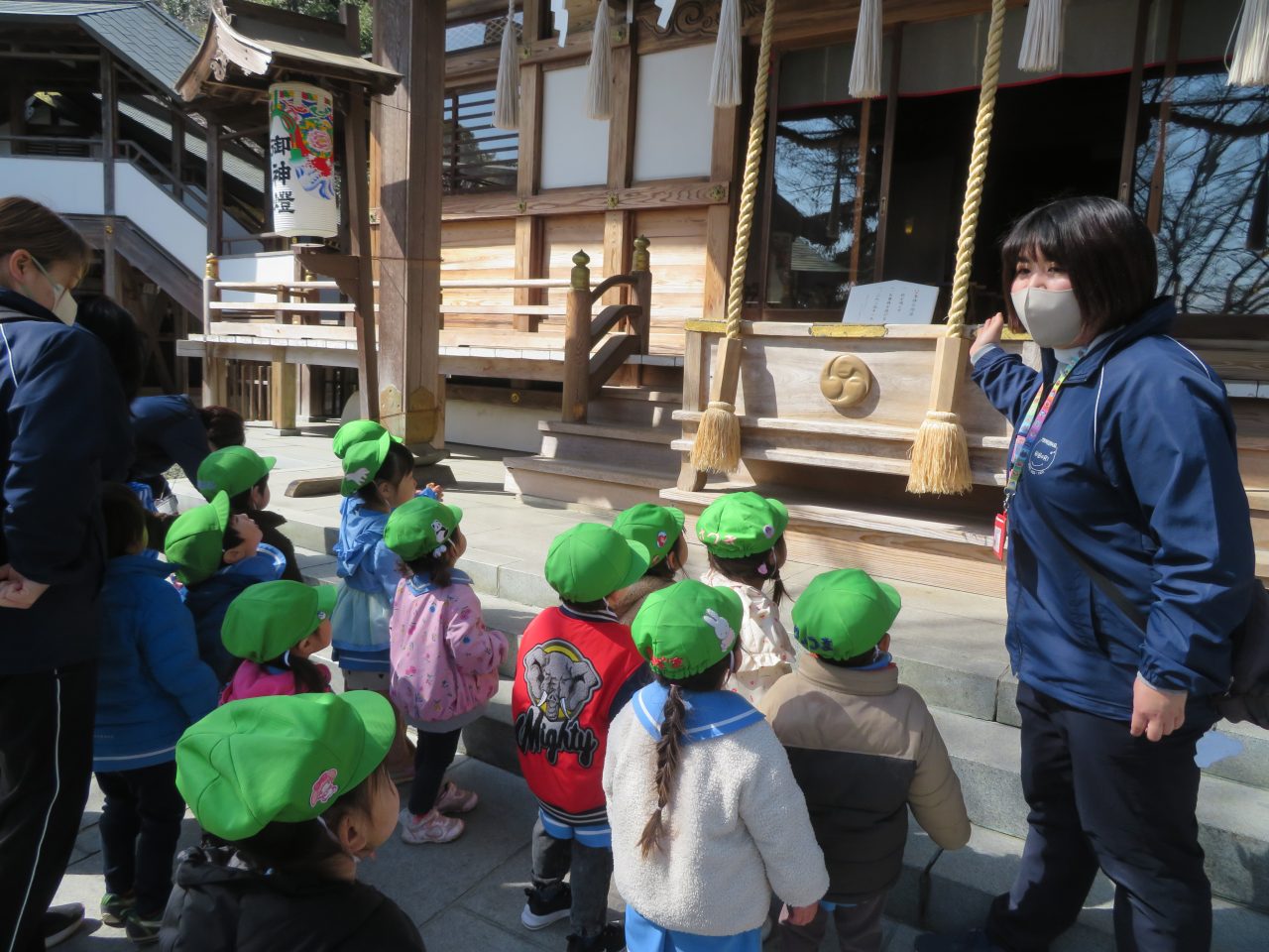 未満児のお別れ遠足でコスモス組は高崎市にある山名八幡宮まで電車で行ってきました!今日は園長先生とえり先生も一緒に行ってくれました!みんなで乗るのは三回目の電車でしたが、大喜びで車内を見たり、周りの風景を楽しんだり、お友達とお話をしたりしていた子どもたちです!今回の電車の中でも「電車って速いよね!」とお話もしていた子がいました😆神社ではお参りをしたり、散策をしたり、動物クイズを楽しみました!お昼はシートに座って電車を眺めながら、おにぎりやお菓子を食べました!おにぎりの用意ありがとうございました!ご飯の後に時間があったので集団遊びも楽しみました!帰りは瞬先生がバスで迎えに来てくれてみんなでバスに乗って帰ってきました、つかれて寝てしまうかと思いきやほとんどの子は元気で園まで起きていました😆お昼寝はぐっすりです!楽しい思い出ができて良かったです!今日、残念ながらお休みの子もいたので次は全員でお出掛けに行ければいいなと思います~