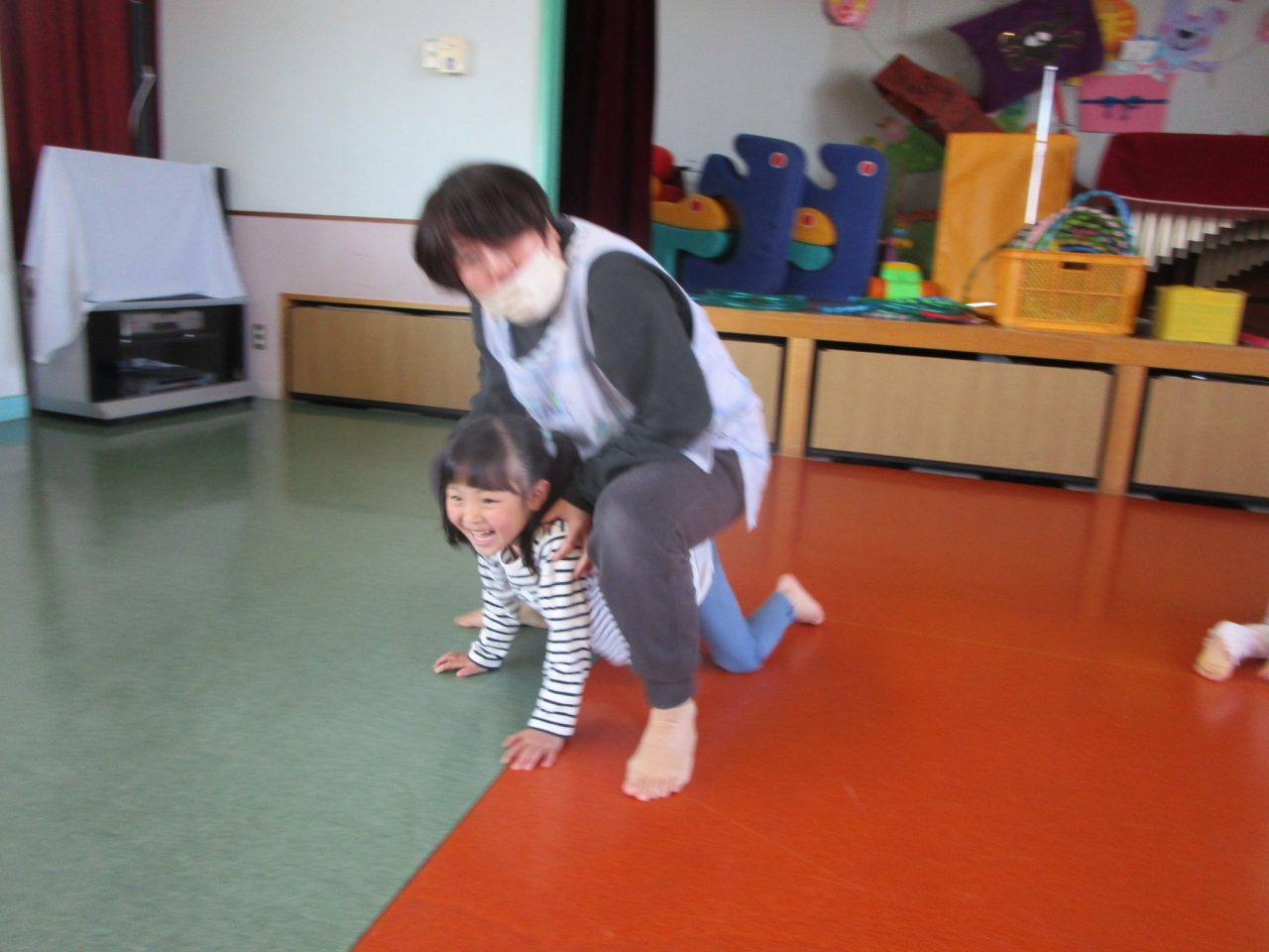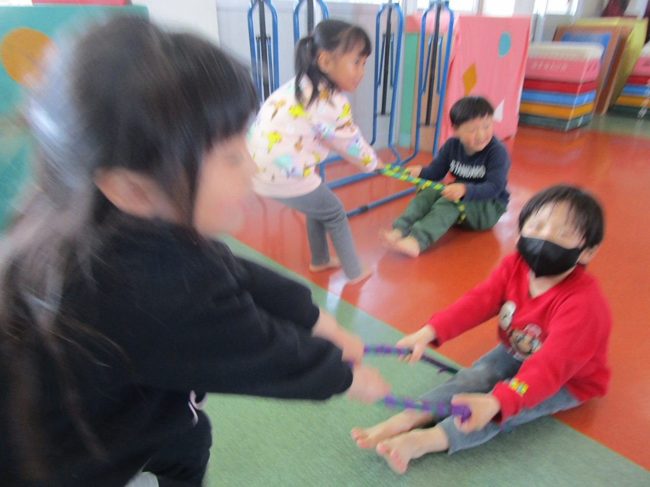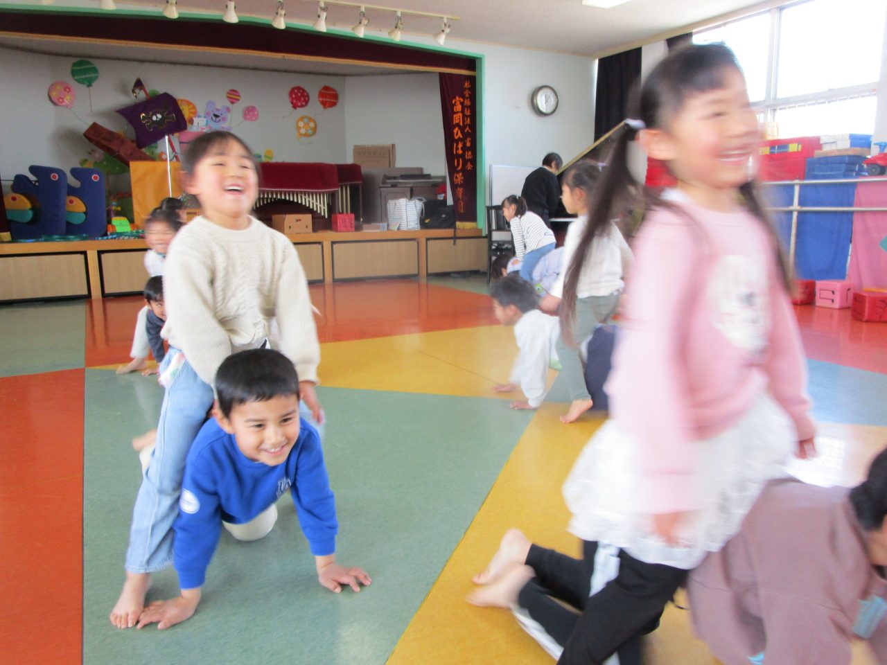 ひな祭りゲームでは、ピアノの途中で聞こえてくる「お雛様」「3人官女」「5人囃子」の言葉をよく聞いてお友達を探します。最後に「お雛様」でペアになったお友達と、フープを使って車になって運んだり、馬になったりして体を動かしました!だんだん役割を変えるのが早くなって大盛り上がりでした♪