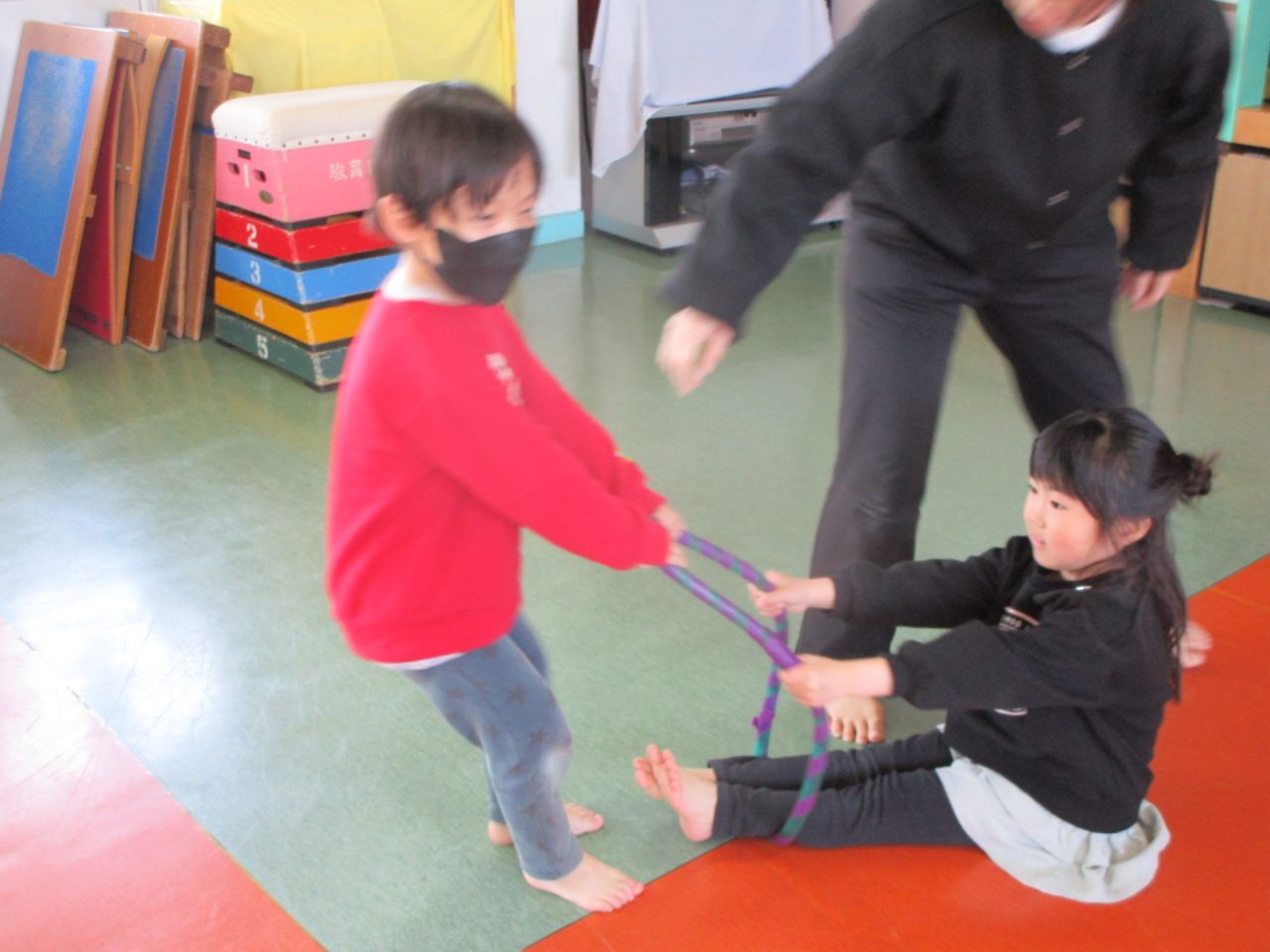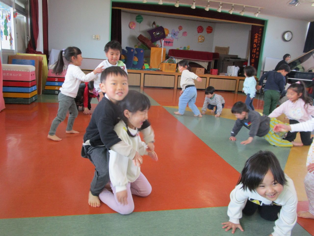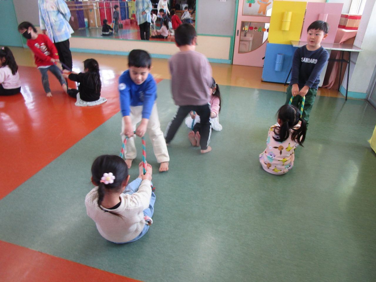 ひな祭りゲームでは、ピアノの途中で聞こえてくる「お雛様」「3人官女」「5人囃子」の言葉をよく聞いてお友達を探します。最後に「お雛様」でペアになったお友達と、フープを使って車になって運んだり、馬になったりして体を動かしました!だんだん役割を変えるのが早くなって大盛り上がりでした♪