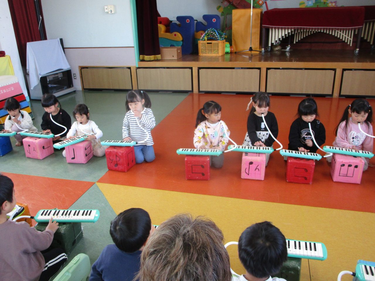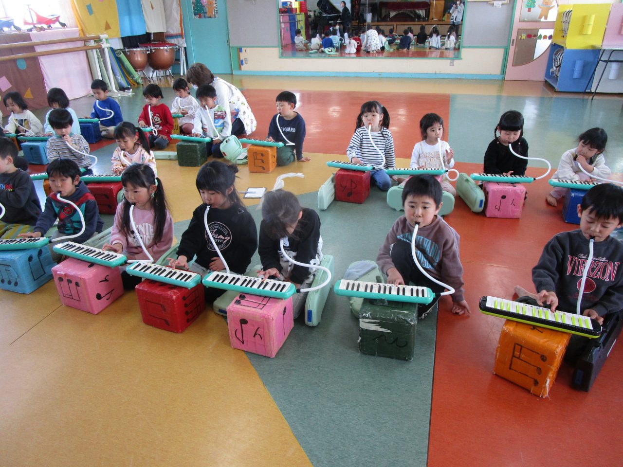 3月11日(水)今年度最後のリズムがありました!午前、午後に分けてひな祭りゲームや、鍵盤ハーモニカなどを頑張りました。